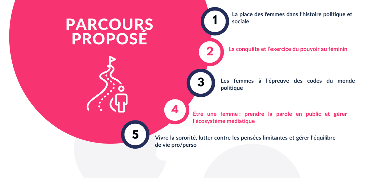 Malgréles lois pour la parité en politique, les femmes demeurent sous-représentées, notamment dans les fonctions les plus symboliques et décisionnaires. Dans un écosystème politique et un monde médiatique conçu davantage pour les hommes, les femmes font face à des obstacles particuliers et nécessitent donc un accompagnement singulier.